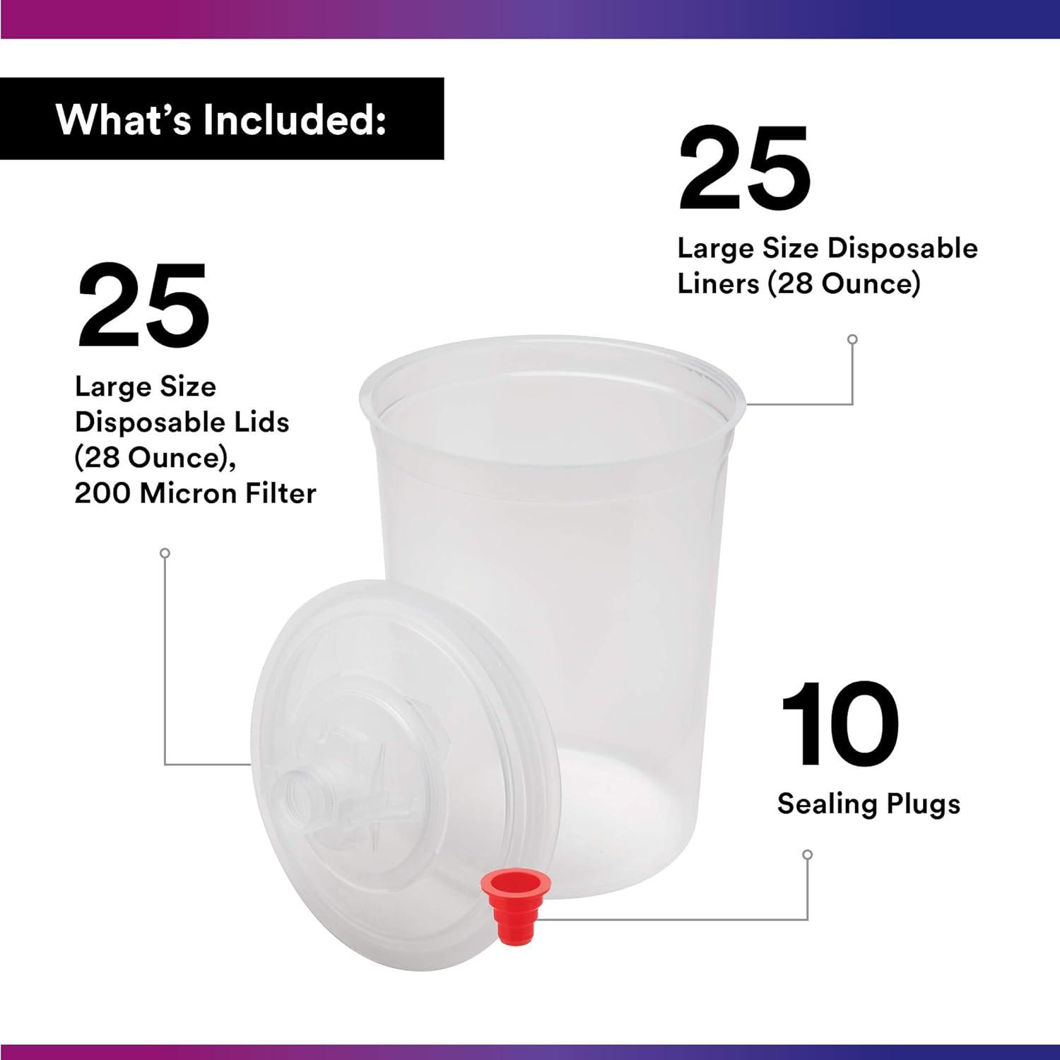3M PPS Large Lids and Liners Kit contains 25 disposable lids, 25 disposable liners and 10 sealing plugs for use with the original PPS spray gun system, an all-in-one solution for measuring, mixing, filtering and spraying paint materials. Unlike conventional aluminum or other metal paint cup systems, with PPS you don’t have to mix paint in extra cups and filter it into a paint reservoir, so you waste less paint. Simply place a liner in the reusable paint cup, mix the paint, snap on the lid, attach the locking collar and you’re ready to spray. With a fresh lid and liner for each mix, there’s less risk of outside contamination. You can also increase productivity in prep and cleanup time by as much as 50% and use up to 70% less cleaning solvent over conventional paint cup systems. Each lid strains paint material with a built-in 200-micron filter, commonly used for solvent-based paint materials. Specially designed PPS stainless steel metal adapters let you use the PPS system with virtually any spray gun.