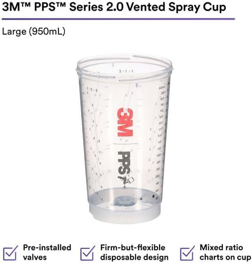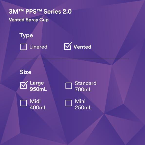 3M™ PPS™ Series 2.0 Vented Cups are ready to use – allowing you to mix, spray, and temporarily store paints and coatings from the same cup. They come with their valves installed and closed to help prevent accidental leaks while filling. Use with any spray gun equipped to use 3M™ PPS™ Series 2.0 Cups.