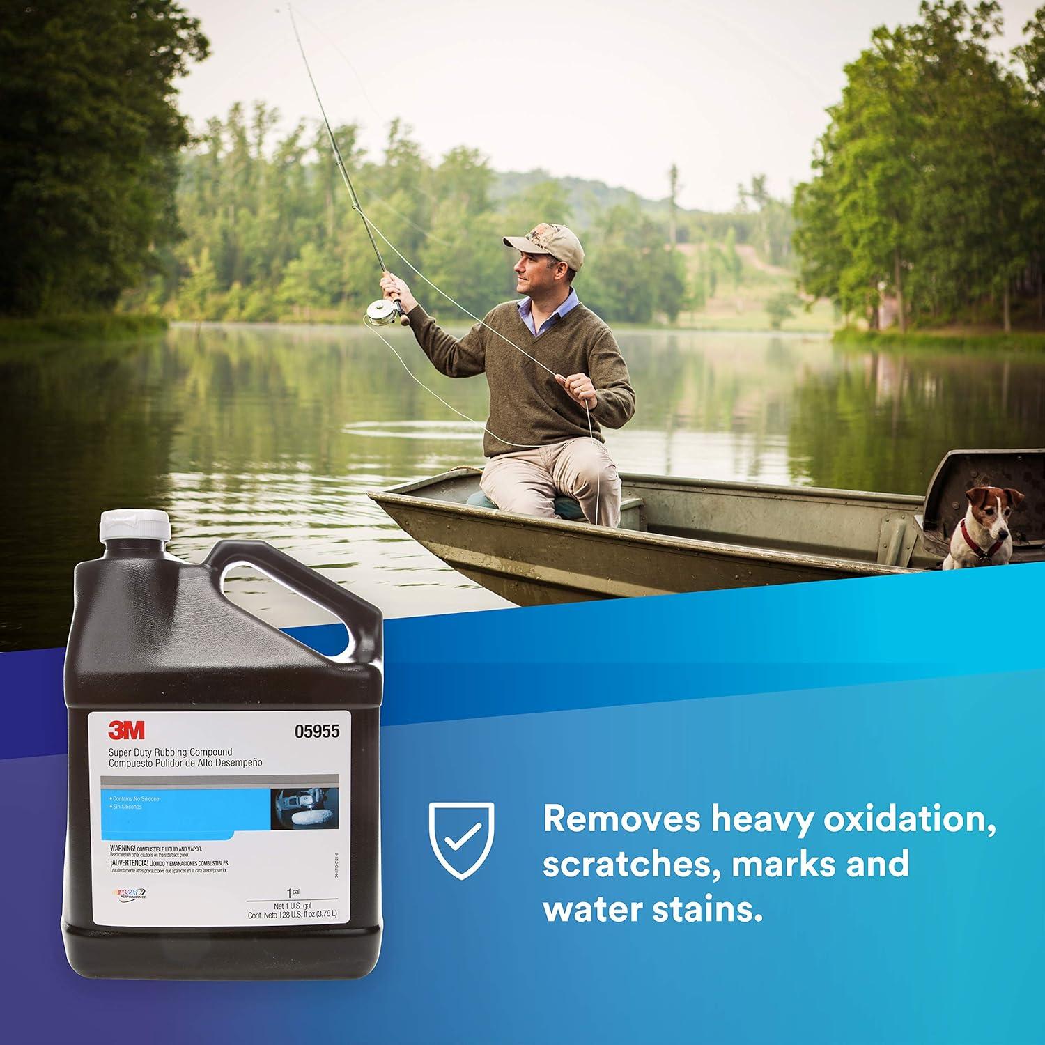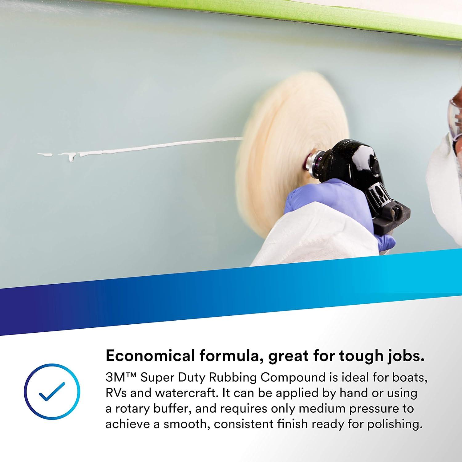 3M™ Super Duty Rubbing Compound aggressively removes heavy scratches, marks and oxidation from aluminum and gelcoats, ideal for boats and watercraft. It can be applied by hand or using a rotary polisher, and requires only medium pressure to achieve a smooth, consistent finish ready for polishing. This heavy-cut compound stays wet for a long time, so you can cover more surface without having to reapply it.